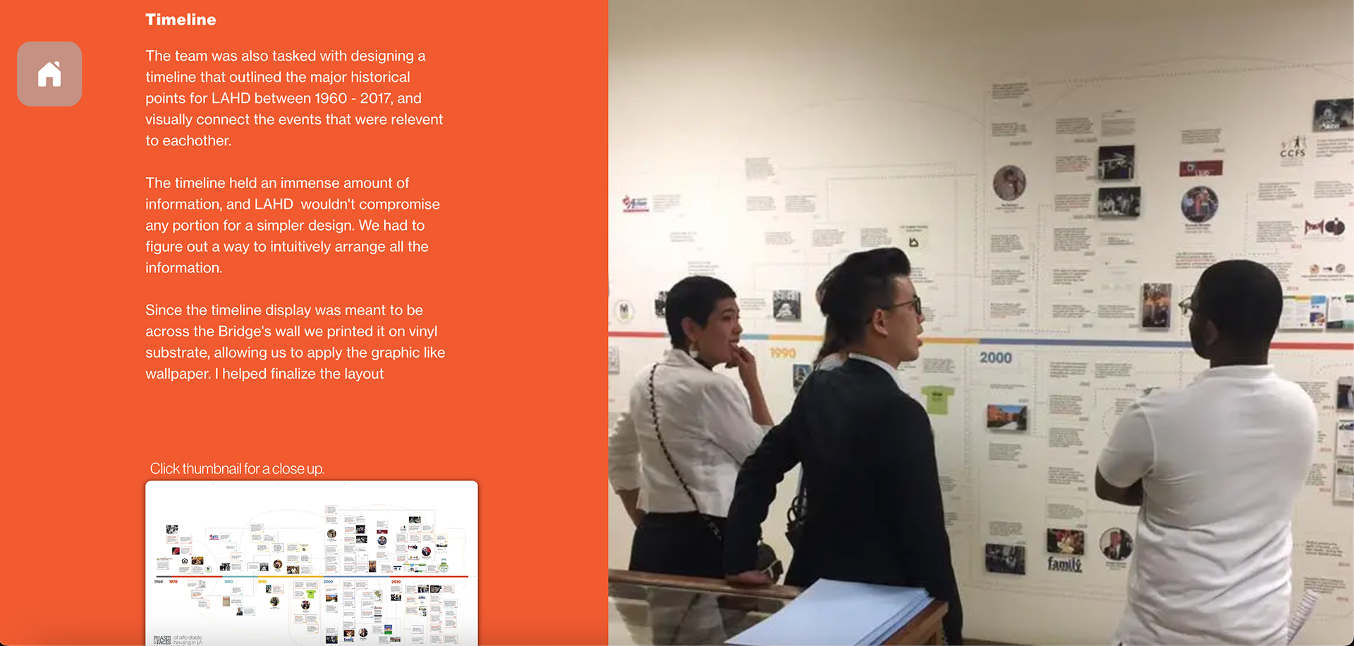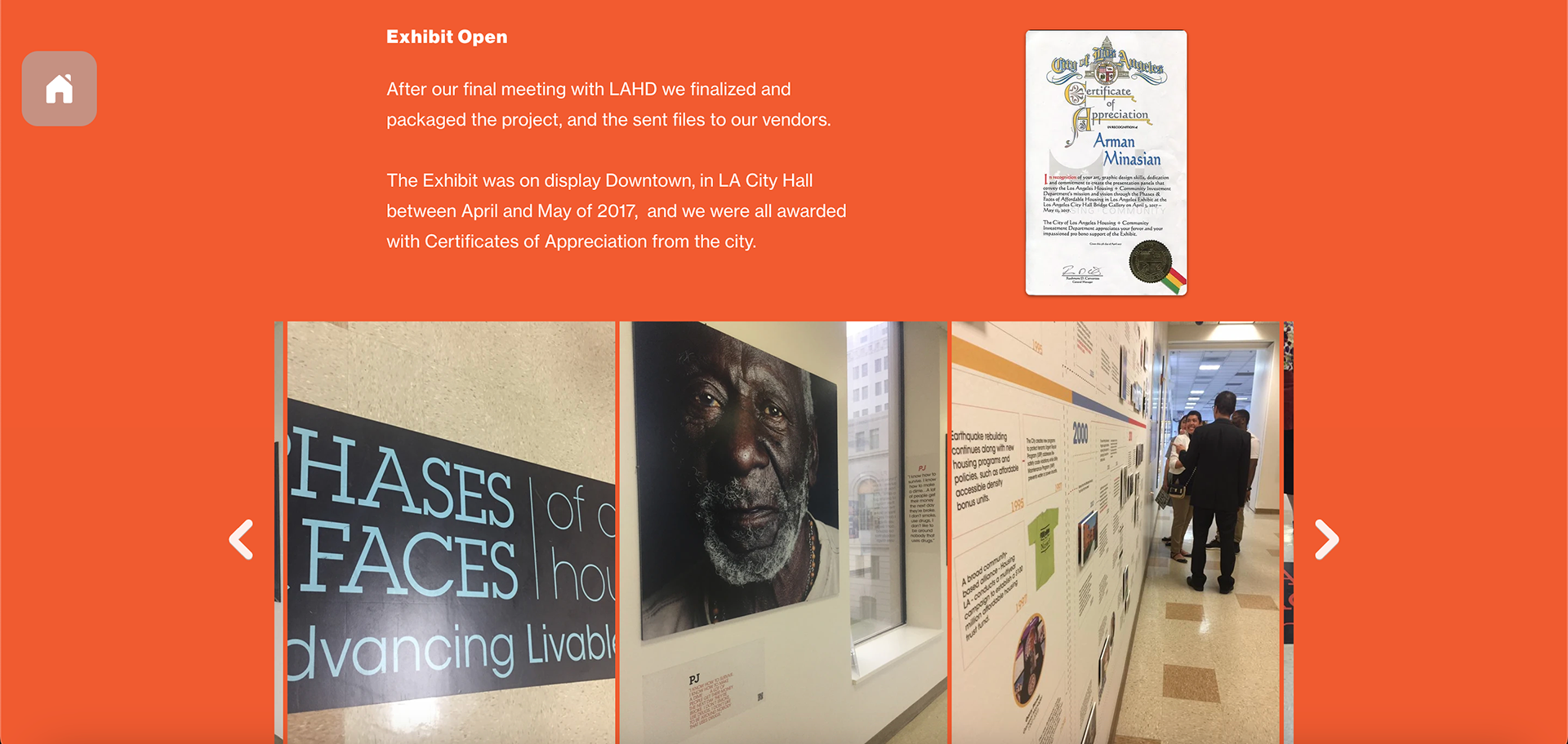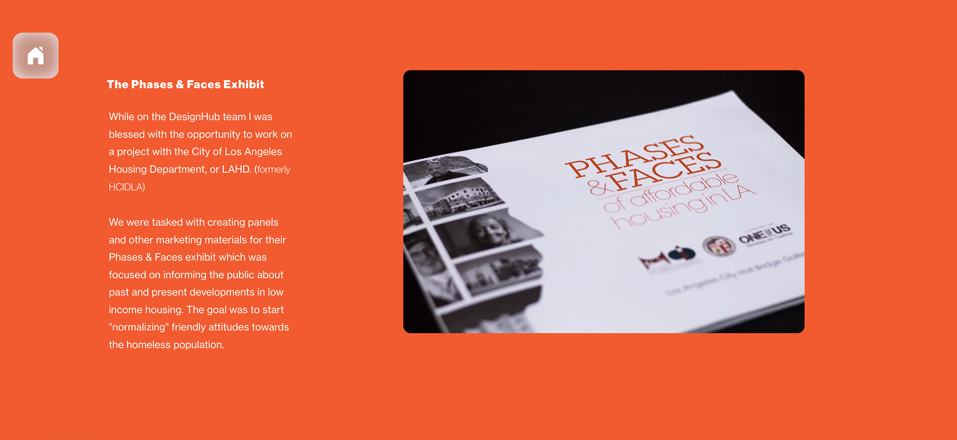 Collaborated with a group of 25-30 designers creating the "Phases and Faces" exhibit as a pro bono project for the Los Angeles Housing Dept. We created the full display and experience for the exhibit hosted in LA's City Hall (2017). We were tasked with creating the branding, marketing materials, displays, catalogs, and a large scale timeline of events for the event.